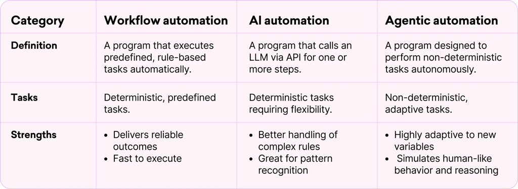 AI Agents are a step into the latest – and fully non-deterministic – age of automation. Instead of following strict rules, workflows that employ "agentic automation" can now become adaptive, context-aware, and autonomous. This isn't to say that other types of automation are bad or unable to cope; on the contrary, traditional automation remains the most efficient way to take care of straightforward tasks. But for multilayered problems, an automation program needs the ability to adjust its actions in real time, collaborate with other AI systems, and make accurate decisions, all with minimal or no human intervention.
